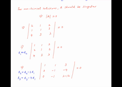 Determine the value of λ for which the system of equations have non–zero / non–trivial solutions 2x + y + 2z = 0, x + y +3z = 0, 4x + 3y + λz = 0.