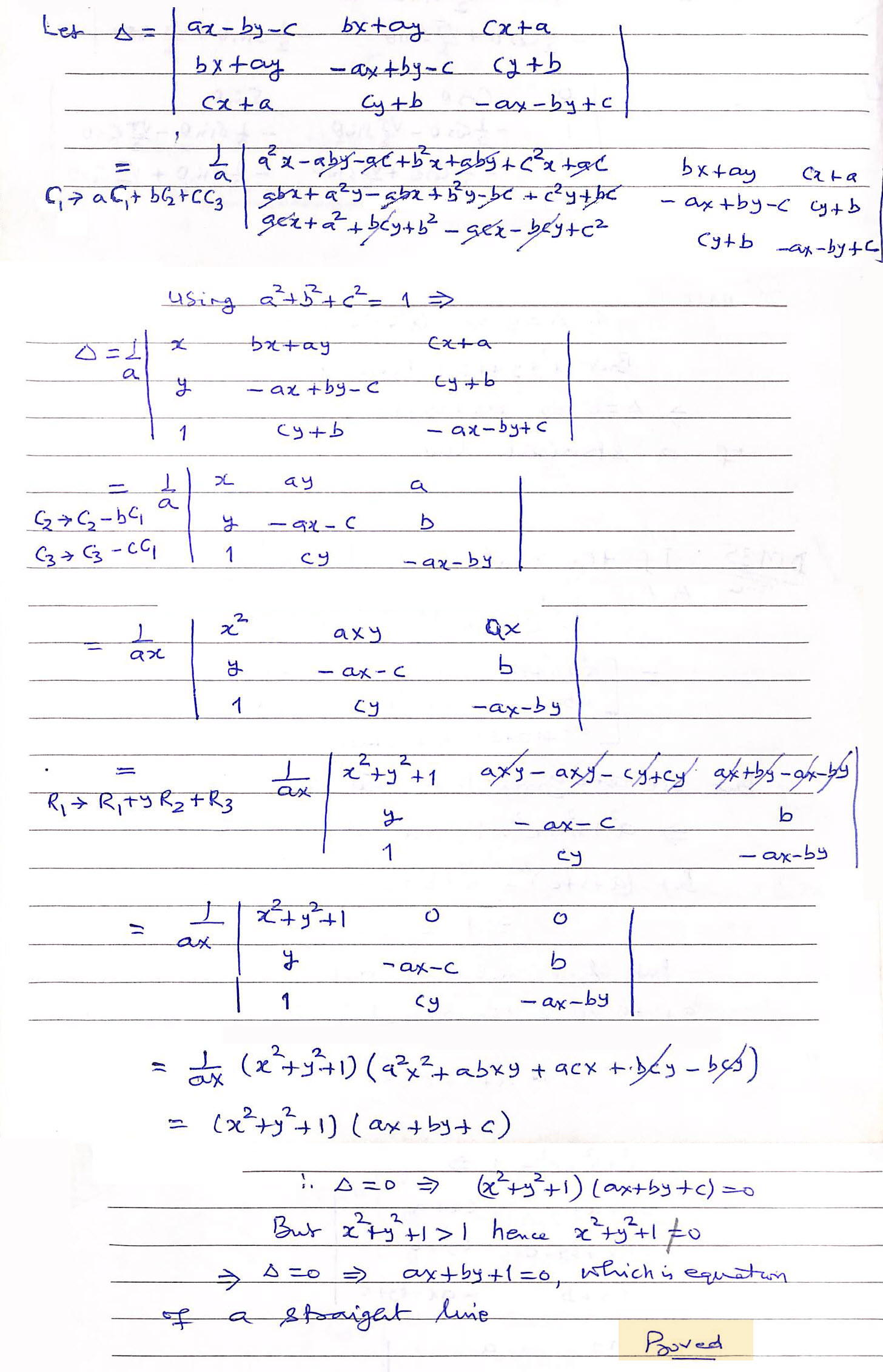 Let a, b, c be real numbers with a2 + b2 + c2 = 1. Show that the equation represents a straight line = 0