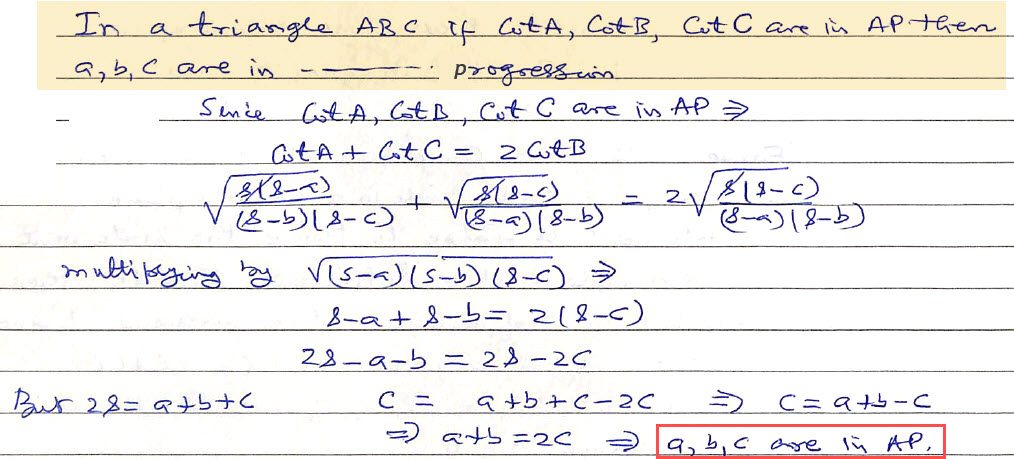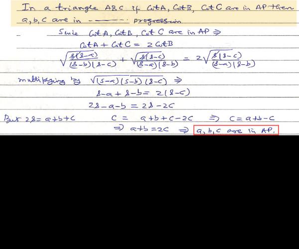 In a triangle ABC if cotA, cotB, cotC are in Arithmetic Progression then a, b, c are in .  .  .  .  . Progression.
