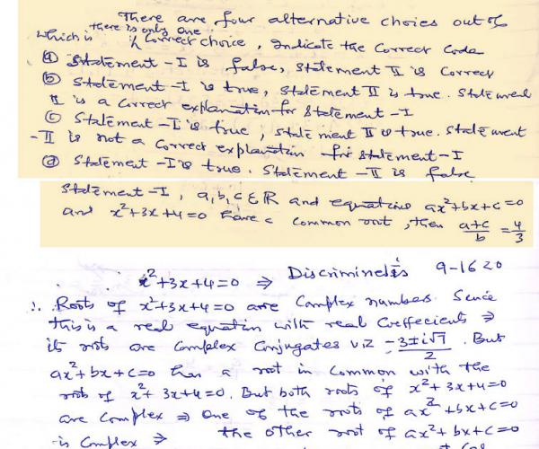 Statement 1 – a, b, c ε ℝ and equations  and  have a common root, then