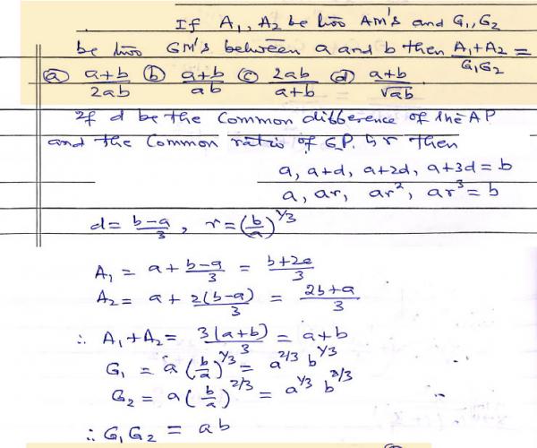 If  be two arithmetic means and  be two geometric means between a and b then  is equal to