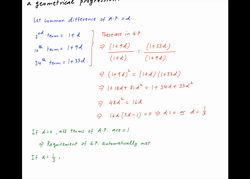 Find an arithmetic progression whose first term is unity such that the second, tenth and thirty fourth sums form a geometric progression.