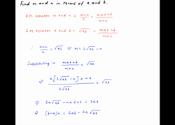 The arithmetic mean between m and n and the geometric mean between a and b are each equal to ; find m and n in terms of a and b.