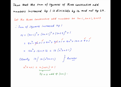 Show that the sum of squares of three consecutive odd numbers increased by 1 is divisible by 12 and not by 24.