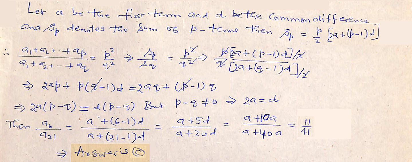 Let a1, a2, a3 ………. be terms of an arithmetic progression. If = , p ≠ q then equals