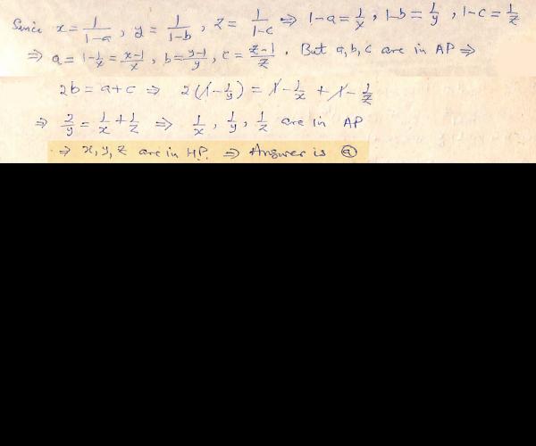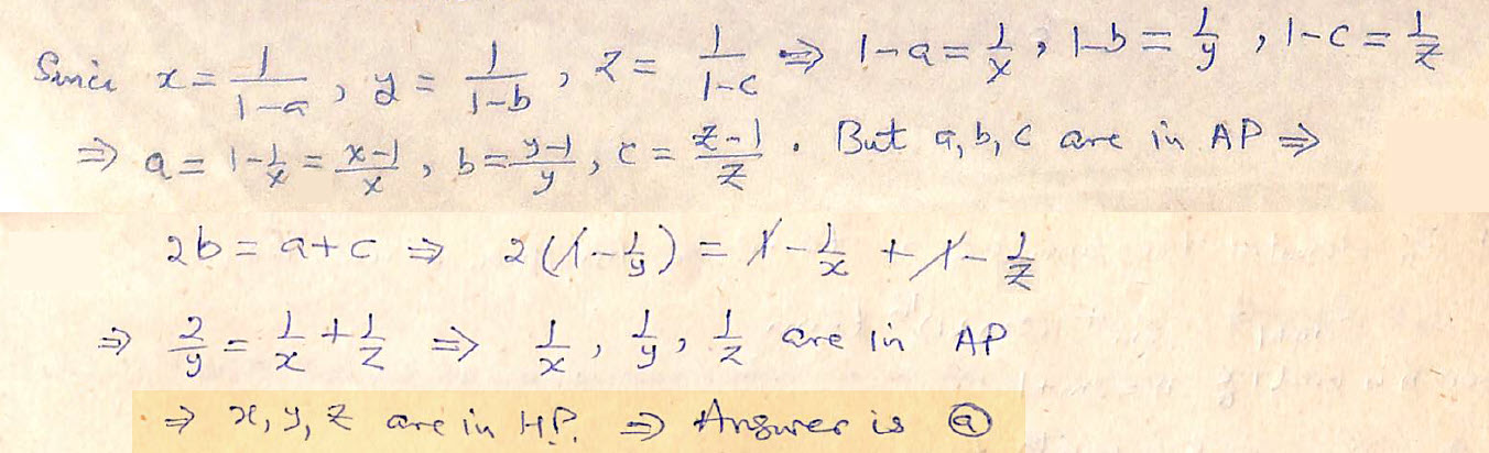 If x = , y = , z = where a, b, c are in arithmetic progression and |a| < 1, |b| < 1, |c| < 1, then x, y and z are in
