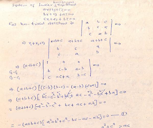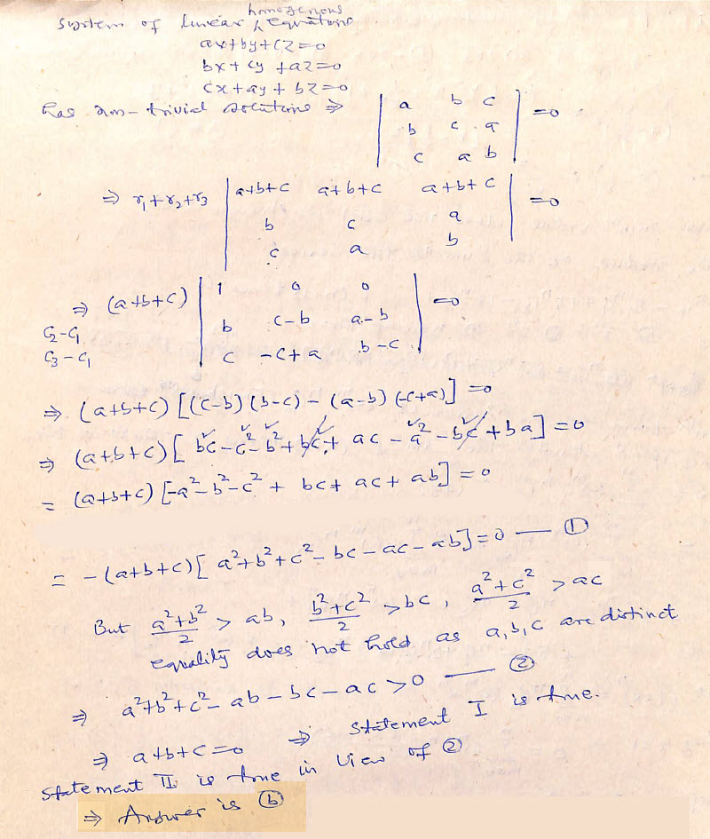 Statement I: If a, b, c are distinct and x, y, z are not all zeros and ax + by + cz = 0, bx + cy + az = 0, cx + ay +bz = 0 then a + b + c = 0