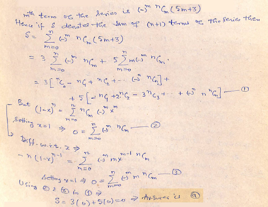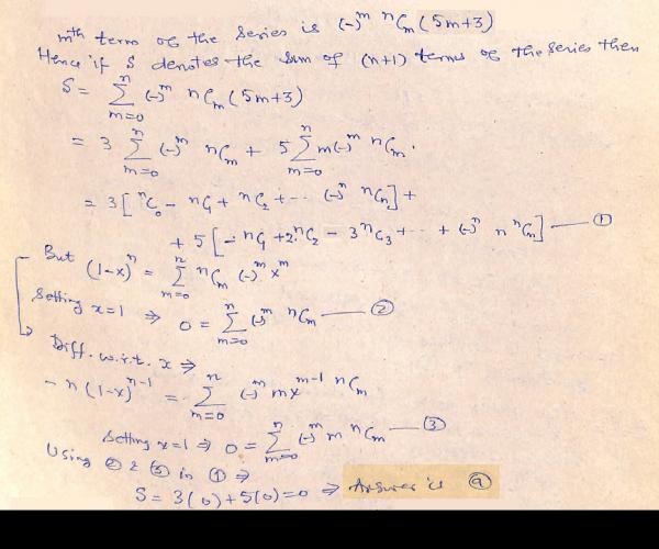 The value of the sum of the series 3 nC0 – 8 nC1 + 13 nC2 – 18 nC3 +  .  .  .  .  . + ( n + 1 ) terms is