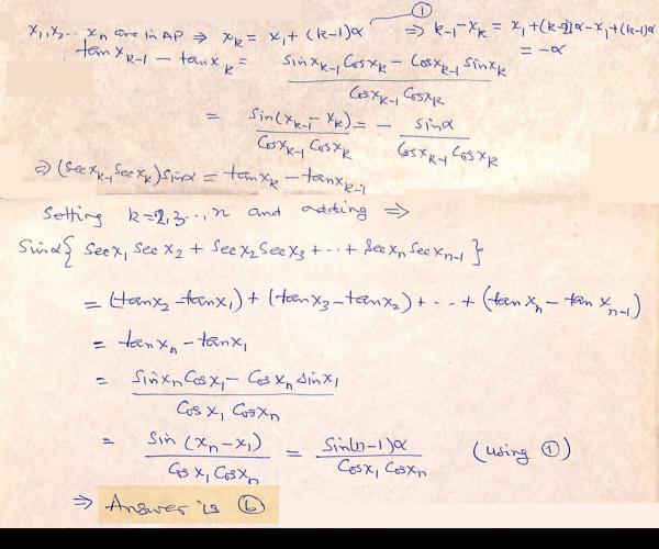 If x1, x2, …. , xn are in Arithmetic Progression whose common difference is α then the value of sin α { sec x1 sec x2 + sec x2 sec x3 + ….. + sec xn - 1 sec xn } is equal to