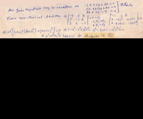 If a, b, c are real numbers, suppose that there are real numbers x, y, z not all zero such that x = cy +bz, y = az + cx and z = bx + ay then a2 + b2 +c2 + 2abc is equal to