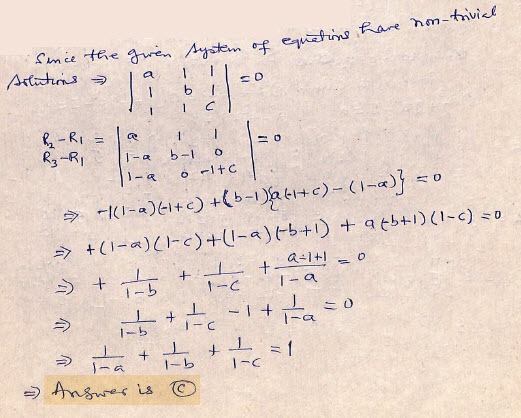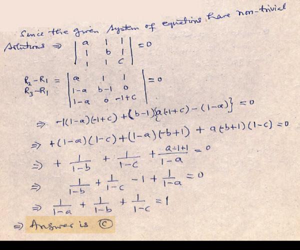 The system of equations ax + y + z = 0, x + by + z = 0 and x + y + cz = 0 where a, b, c ≠ 1 has a non–trivial solution then the value of  +  +  is