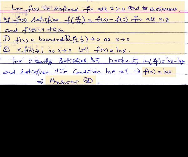 Let f(x) be defined for all x > 0 and be continuous. If f(x) satisfies for all x, y and f(e)=1 then