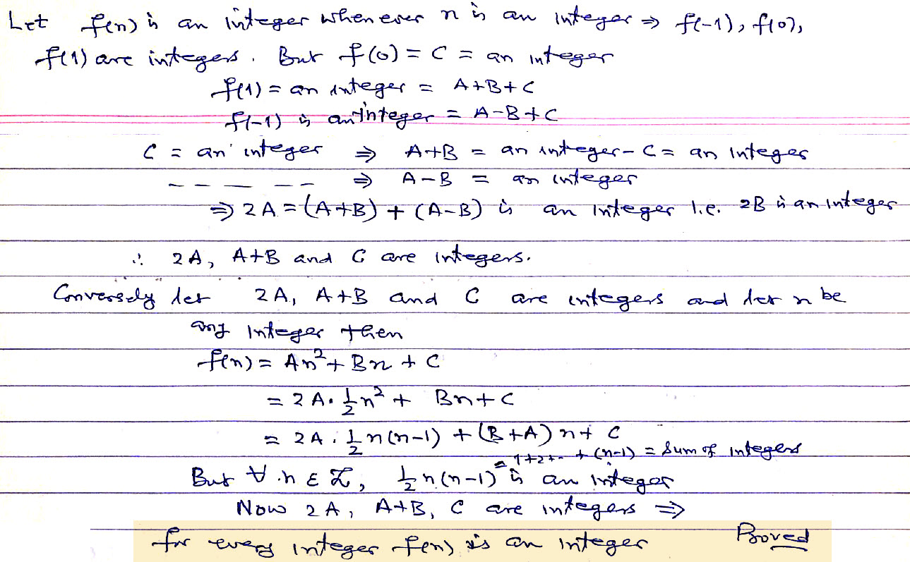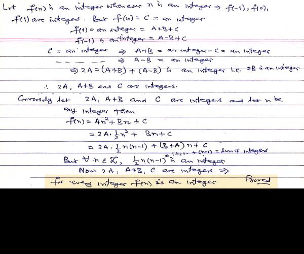 Let where A, B, C are real numbers. Prove that if f(n) is an integer whenever n is an integer, then the numbers 2A, A + B and C are all integers. Conversely prove that if the numbers 2A, A + B and C all integers then f(n) is an integer whenever n is an integer.