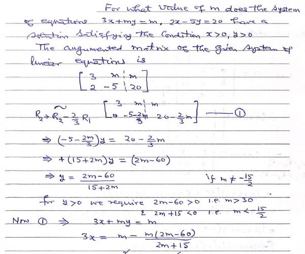 For what value of m does the system of equations 3x + my = m, 2x − 5y = 20 have a solution satisfying the condition x > 0, y > 0.