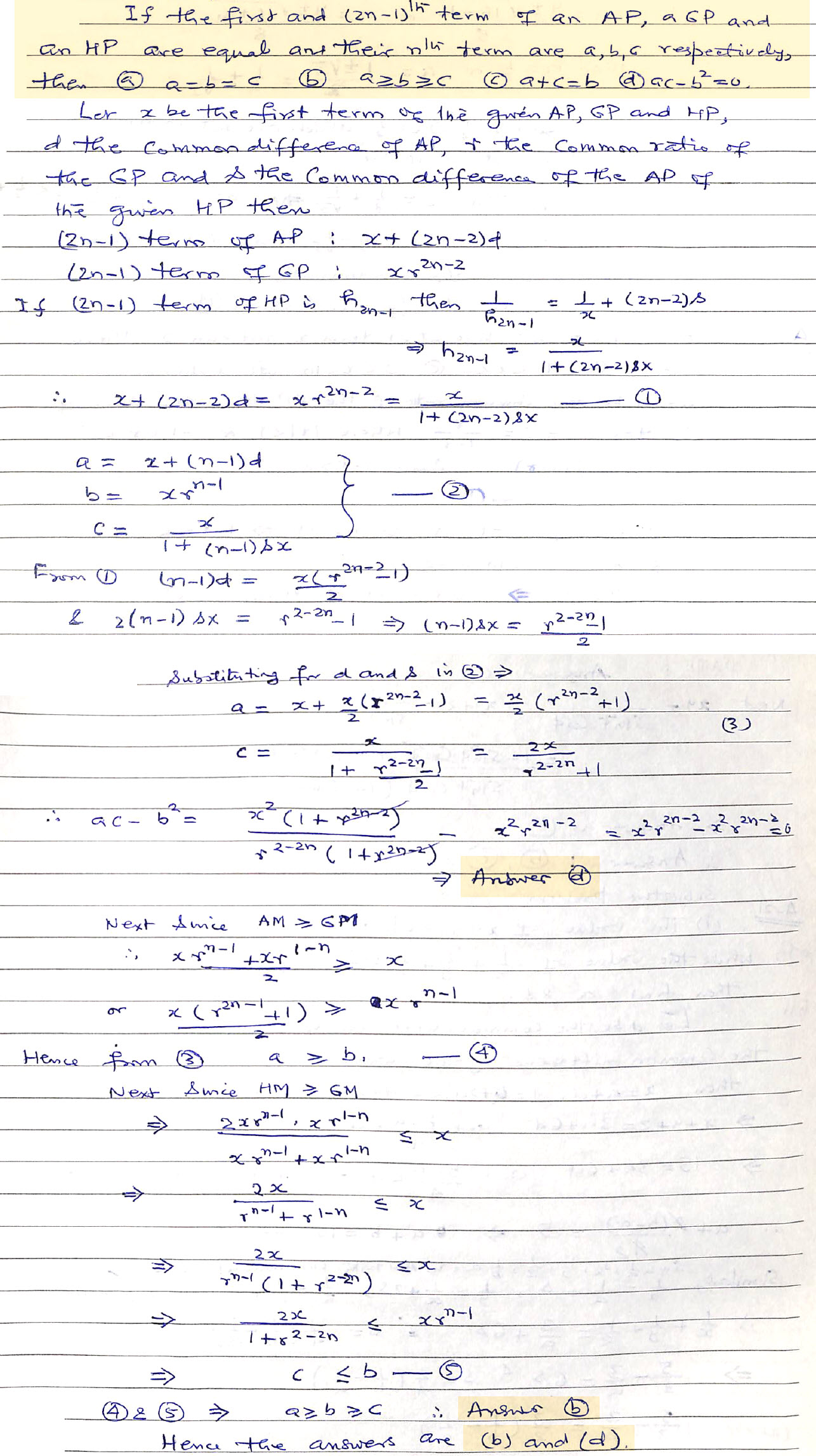If the first and term of an Arithmetic Progression, a Geometric Progression and a Harmonic Progression are equal and their nth term are a, b, c respectively then