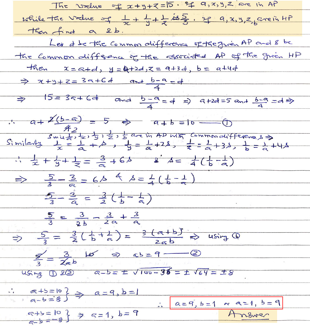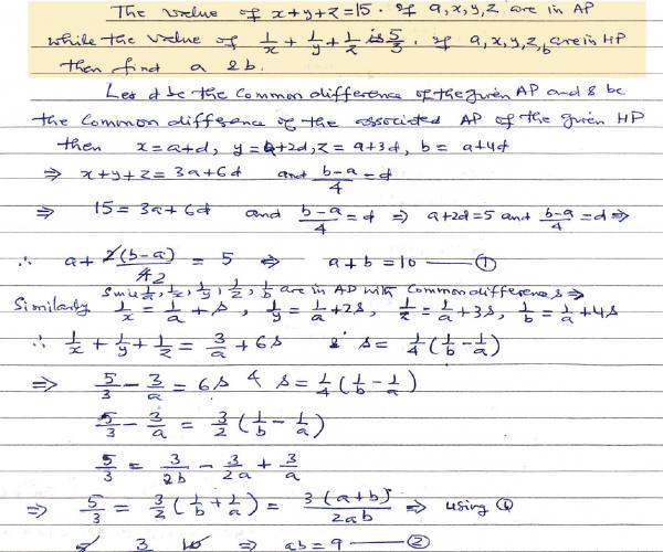 The value of . Given that a, x, y, z, b are in Arithmetic Progression while the value of . If a, x, y, z, b are in Harmonic Progression then find a and b.