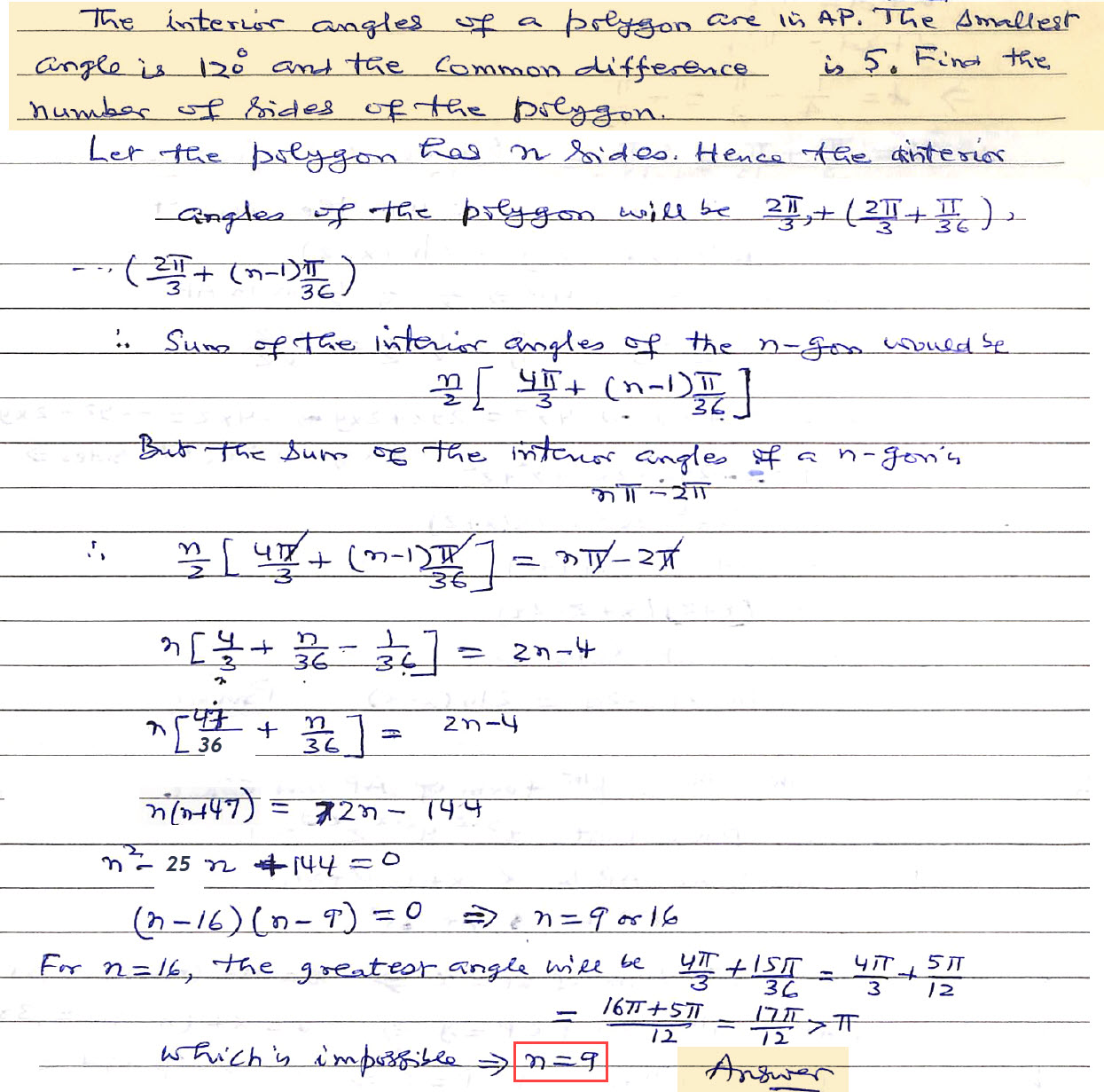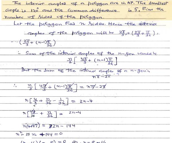 The interior angles of a polygon are in Arithmetic Progression. The smallest angle is 120° and the common difference is 5. Find the number of sides of the polygon.