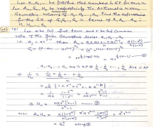 Let a1, a2, … an be positive real numbers in Geometric Progression. For each n let An, Gn, Hn be respectively the arithmetic mean, geometric mean and harmonic mean of a1, a2, .  .  .  ., an. Find the expressions for the Geometric mean of G1, G2, .  .  .  .Gn in terms of A1, A2, .  .  .  .,An; H1, H2, .  .  .  .Hn