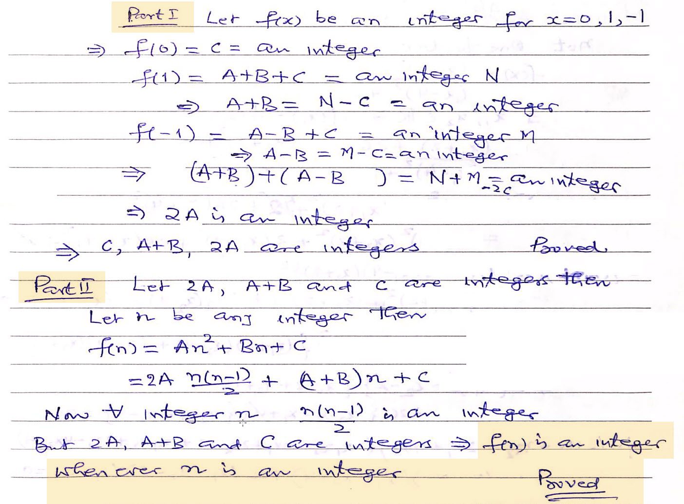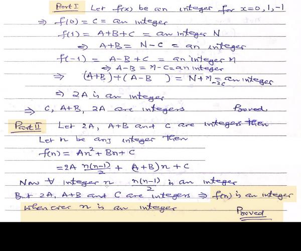 Let f (x) = Ax2 + Bx + C where A, B , C are real numbers. Prove that if f (x) is an integer then the numbers 2A, A + B and C are all integers. Conversely prove that if the numbers 2A, A + B and C are all integers then f ( x ) is an integer whenever x is an integer.