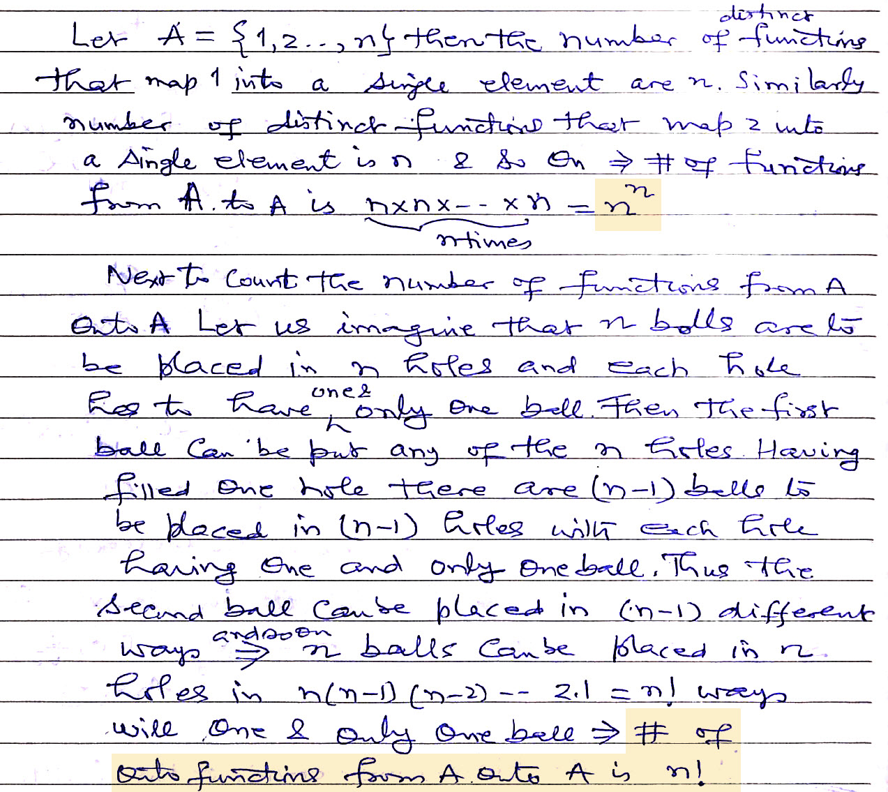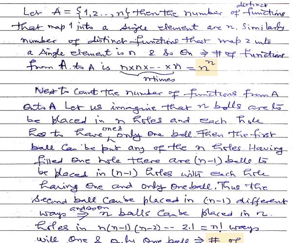 Let A be the set of n distinct elements then the total number of distinct functions from A to A is ……… and out of these …… are onto