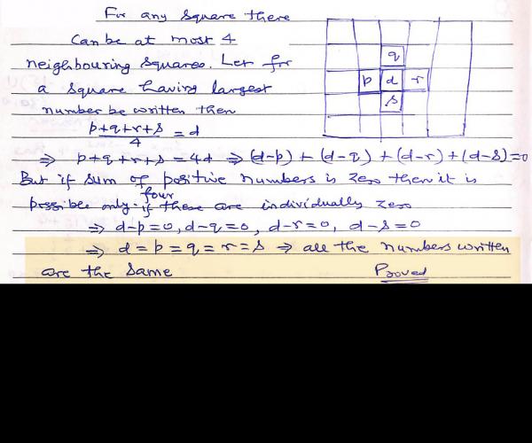 mn squares of equal size are arranged to form a rectangle of dimension m by n, where m and n are natural numbers. Two squares will be called neighbours if they have exactly one common side. A natural number is written in each square such that the number written in any square is the arithmetic mean of the numbers written in the neighbouring squares. Show that this is possible only if all the numbers used are equal.