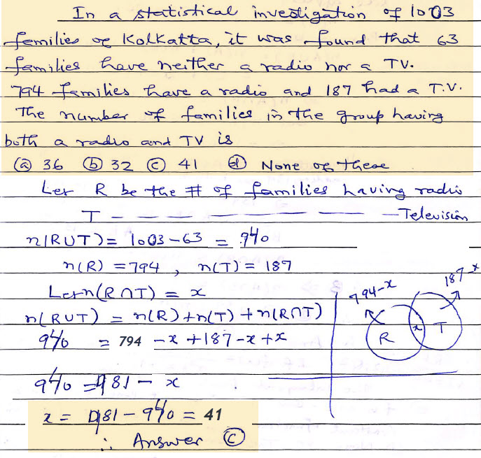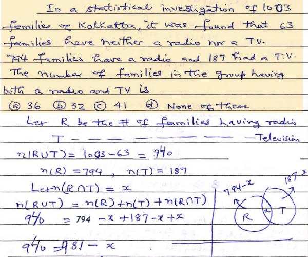 In a statistical investigation of 1003 families of Kolkata, it was found that 63 families have neither a radio nor a T.V. 794 families have a radio and 187 have a T.V. The number of families in the group having both a radio and a T.V. is