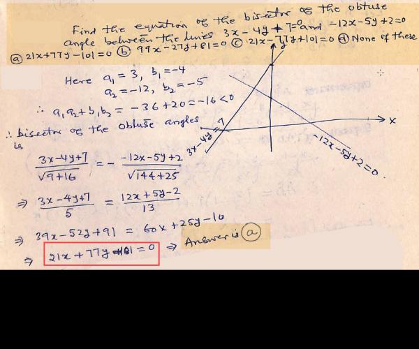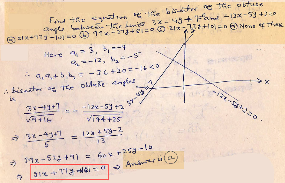 Find the equation of the bisector of the obtuse angle between the lines 3x – 4y + 7 = 0 and – 12x – 5y + 2 = 0.