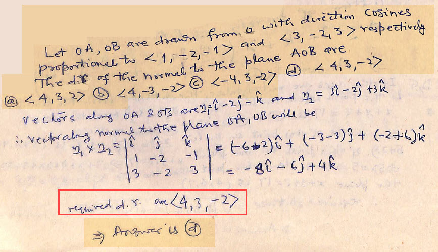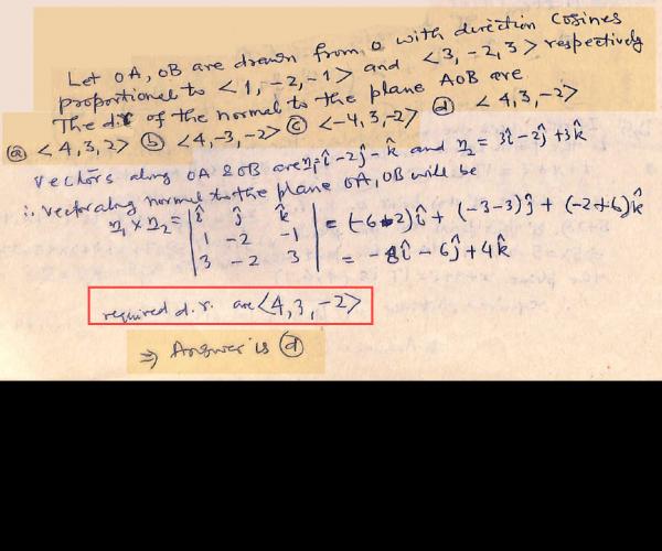Let OA, OB are drawn from origin with direction cosines proportional to <1, – 2, –1> and <3, – 2, 3> respectively. The direction ratio of the normal to the plane AOB are