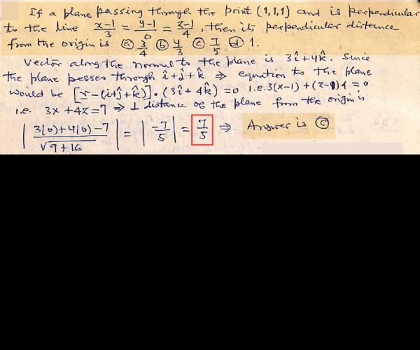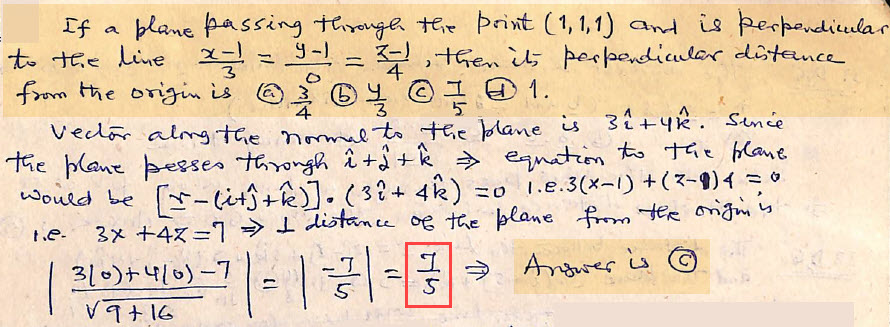 If a plane passing through the point (1, 1, 1) and is perpendicular to the line  =  , then its perpendicular distance from the origin is