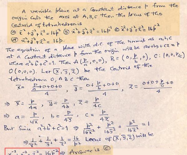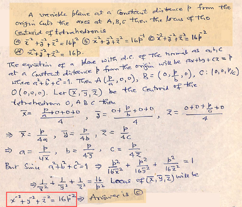 A variable plane at a constant distance p from the origin cuts the axes at A, B, C then the locus of the centroid of tetrahedron is