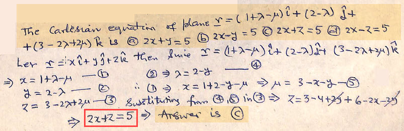 The cartesian equation of plane r = (1 + λ  µ) î + (2 – λ) ĵ + (3  2λ + 2µ) k̂ is