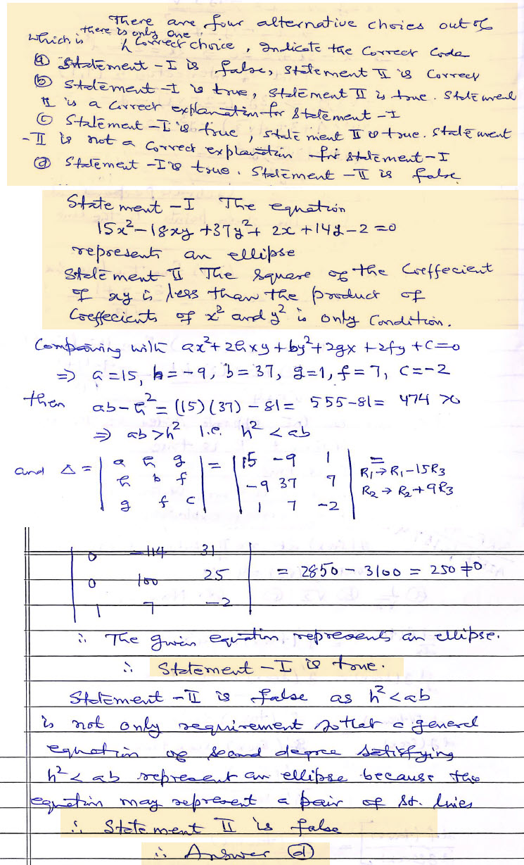Statement 2 – The only condition for a general equation of second degree to be an ellipse is that the square of the coefficient of xy is less than the product of coefficients of  and