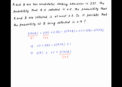 A and B are two candidates seeking admission in IIT. The probability that A is selected is 0.5 and the probability of A and B being selected is at most 0.3. Is it possible that the probability of B being selected is 0.9?