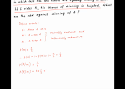 A is one of 6 horses entered for a race, and is to be ridden by one of the two jockeys B and C. It is 2 to 1 that B rides A, in which case all the horses are equally likely to win. If C rides A, his chance of winning is trebled. What are the odds against winning of A?