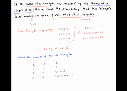 If the sides of a triangle are decided by the throw of a single dice thrice, the probability that the triangle is of maximum area given that it is an isosceles triangle is
