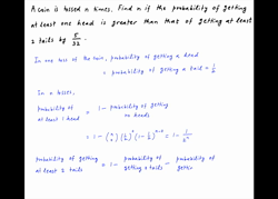 A coin is tossed n times. The probability of getting at least one head is greater than that of getting at least two tails by . Then n is