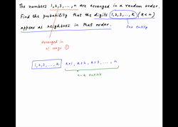 The numbers 1, 2, 3, . . ., n are arranged in a random order. The probability that the digits 1, 2, 3, . . .k (k < n) appears as neighbours in that order is
