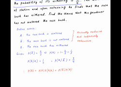 Pal’s gardener is not dependable, the probability that he will forget to water the rose bush is 2/3 The rose bush is in questionable condition. Anyhow if watered, the probability of its withering is 1/2, if not watered, the probability of its withering is ¾. Pal went out of station and on returning, he finds that the rose bush has withered. Then the chance that the gardener did not water the bush is