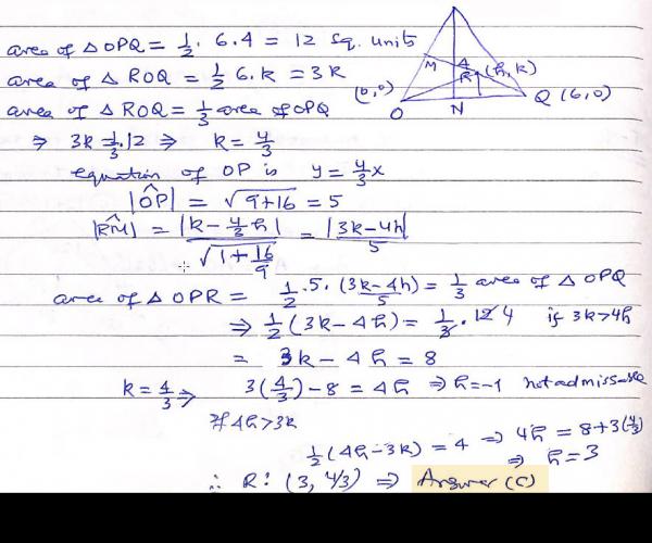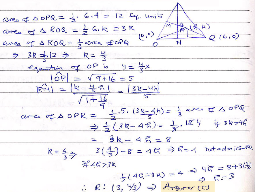 Let O (0, 0), P (3, 4), Q (6, 0) be the vertices of the triangle OPQ. The point inside the triangle OPQ is such that OPR, PQR, OQR are of equal area. The coordinates of R are