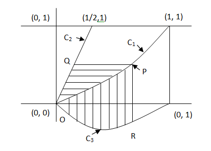 Let C1 and C2 be the graph of the function y = x2 and y = 2x respectively. Let C3 be the graph of the function y = f (x), 0 ≤ x ≤ 1, f (0) = 0. Consider a point P on C1. Let the lines through P, parallel to the axes meet C2 and C3 at Q and R respectively (see figure). If for every position of P (on C1) the area of the shaded regions OPQ and OPR are equal, determine the function f(x).  a) x2 – 1 b) x3 – 1 c) x3 – x2 d) 1 + x2 + x3